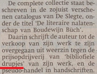 Op 15 Oktober 1991 zou NRC Handelsblad het bericht over deze verrassende actie op een iets sjiekere manier naar buiten brengen en melding maken van het verschijnen van de catalogus DE LITERAIRE NALATENSCHAP VAN BOUDEWIJN BÜCH [8], met verwijzing naar het hierboven al deels geciteerde voorwoord.