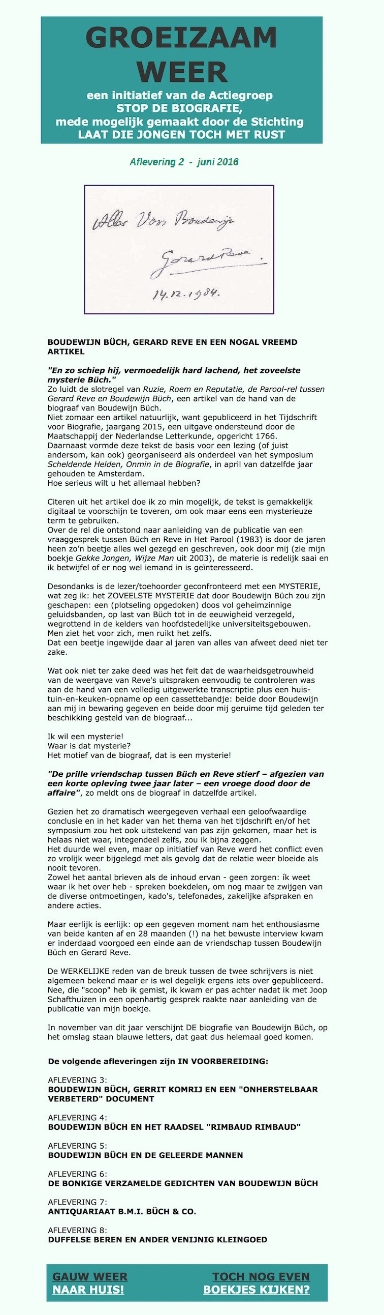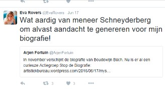 het duel Reve-Büch, al zo'n 22 jaar eerder op eenzelfde manier en met gelijkwaardige geluidskwaliteit gemaakt en uitgezonden had kunnen worden? En dat Boudewijn Büch wel degelijk zelf pogingen heeft gedaan deze zaak uit de wereld te helpen? U wellicht niet, de makers ervan wel. U ziet het: de biograaf van Gerrit Komrij heeft iets losgemaakt bij mij. -------------- [1] Zie: Eva Rovers. Boud, het Verzameld Leven van Boudewijn Büch (Amsterdam 2016), pagina 367 en de aanvullende noot 32 op pagina 534. In deze noot wordt gerefereerd aan een faxbericht waarmee in de loop der tijd enkele wonderlijke handelingen verricht zijn. [2] Als bepaalde delen van haar tekst in deze vorm zouden zijn gepubliceerd, had deze biograaf de oplettende lezer het een en ander uit te leggen gehad. Voor mijn dienstbaarheid in dezen ben ik overigens nooit bedankt, jammer! [3] Over Groeizaam Weer gesproken: Jaargang 2015 van het Tijdschrift voor Biografie (een uitgave ondersteund door de Maatschappij der Nederlandse Letterkunde) bevat een artikel van de hand van Eva Rovers getiteld Ruzie, Roem en Reputatie, de Parool-rel tussen Gerard Reve en Boudewijn Büch. In deze voorpublicatie - ook voorgedragen tijdens een drukbezocht Amsterdams symposium - beweert mevrouw Rovers tegen beter weten in dat Büch er alles aan gedaan heeft om ervoor te zorgen dat het materiaal aan de hand waarvan het Parool-interview is opgesteld buiten het bereik van derden zou blijven; ze sluit als volgt af: En zo schiep hij, vermoedelijk hard lachend, het zoveelste mysterie Büch. Kijkt u even wat er in dit verband uiteindelijk op pagina 273 van de door haar geschreven biografie werd afgedrukt; let u daarbij vooral ook op de aandoenlijke klunzigheid. |
