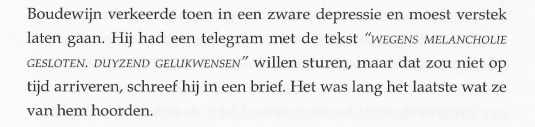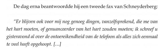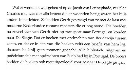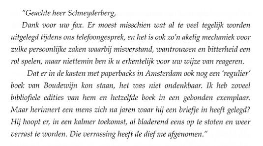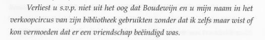 De in het boekje afgedrukte tekst is niet compleet, in de originele fax reutelt Komrij nog even door, met name over de omstandigheden die geleid hebben tot deze voor hem nogal ongelukkige situatie. Hij meent op vertrouwelijkheid te kunnen rekenen en eindigt met: Wat wel van belang is, u zult het begrijpen, is dat u mij hebt beloofd Boudewijn van ons gesprek op de hoogte te stellen. Verdorie, zojuist door Gerrit bevorderd van Vuilnisman tot Postillon d'Amour en niemand die het weten mag. Waar moet dit naar toe? Uiteraard heb ik Boudewijn op de hoogte gesteld van dit alles, maar het interesseerde hem niets, helemaal niets. De gedachte aan wraak, in welke vorm dan ook, waar Komrij zo bang voor was is niet eens bij hem opgekomen. Ik kreeg sterk het idee dat Gerrit van mening was dat alles zo wel in orde was, daar was ik het bij nader inzien (nog) niet mee eens. | ||
