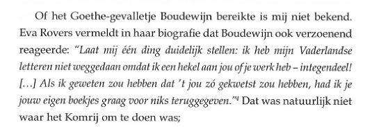 Inkorten betekent keuzes maken en vanzelfsprekend heeft de biograaf die vrijheid, maar door het weglaten van meerdere cruciale fragmenten laat hij zich wat mij betreft iets te veel in de kaart kijken. Hieronder zomaar een paar regels uit die gesneuvelde fragmenten, waarbij men zich natuurlijk allereerst moet afvragen wat de werkelijke reden was dat deze discussie gevoerd werd, en bovendien waarom Komrij een en ander met mij uitvocht en niet met Boudewijn zelf. Dat u zegt dat uw toon streng is, lijkt me een understatement. Wel geeft u mij een beetje het gevoel mee dat ik mij puntsgewijs moet verdedigen, en dat is geen aangenaam gevoel. De rest is literatuur, het gegrom van de roddel, en de boze buitenwereld. Vanzelfsprekend speelt die wereld ons parten. Ik ben geïrriteerd geraakt en dan begint men misschien dingen te zien die er niet zijn. En dit, altijd en overal zeer bruikbaar: Dat zat toch werkelijk veel simpeler in elkaar. Oei, moet de biograaf gedacht hebben, Gerrit moet aan de bak, dat kunnen we niet hebben. Manipulatie noem ik dat, schaamteloze manipulatie. Met het openbaar maken van het volgende fragment doet de biograaf overigens niemand een plezier: | ||