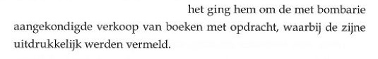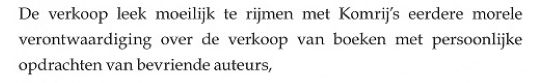 Jawel, de biograaf vertelt ons waar het Komrij wel en niet om te doen was, maar de biograaf is in de war, heel erg in de war. Er was namelijk helemaal geen bombarie, althans geen bombarie die niet zelf door Komrij en zijn krantenstukjes was veroorzaakt, hij was er verbazend vroeg bij. NRC Handelsblad had de primeur [7], het berichtje was vrij kort en zakelijk, er wordt geen schrijversnaam - laat staan die van Komrij - in genoemd. In het begin van zijn tekst gebruikt de biograaf dit laatstgenoemde feit nog expliciet om zijn eigen theorieën [8] te ondersteunen, mij zakt hier toch echt de broek van af. Over bombarie gesproken: is de biograaf misschien vergeten wat er in 2004 allemaal door Komrij en consorten op poten werd gezet op het moment dat hij zijn collectie, inclusief al die brieven van derden [9] in de verkoop deed? Recepties, tentoonstellingen, speurtochten, tennistoernooien, catalogi, ballonvaarten, miss-verkiezingen, paginagrote artikelen in de krant over de o zo bijzondere brieven en ansichtkaarten van Boudewijn Büch aan Gerrit Komrij, ik herinner hem er maar even aan. En dan dit citaat uit het voorwoord van de verkoopcatalogus waarin Komrij rept van het ontwikkelen van: [...] een gevoel [...], een immens gevoel […] dat ik van schrijvers die hun manuscripten en brieven hebben verpatst en die ik om die reden altijd had verguisd juist ontstellend hield. Vindingrijke schrijvers waren dat geweest! Weldoeners van de literaire geschiedschrijving en kenners van de markt! Nooit eerder zag ik hypocrisie zo prachtig verwoord! Maar goed, ik ben handelaar [10], mij hoort u verder niet zeuren. In een datzelfde jaar verschenen biografische schets [11] van Boudewijn Büch liet Komrij met betrekking tot het overboord gooien van zijn eerder zo luid rondgetoeterde principes het volgende optekenen: Daarover ben ik van gedachten veranderd, maar toen vond ik dat. Natuurlijk, kan gebeuren. Alles in één keer uit de wereld, nu nog even de schade opnemen, wij lezen mee: [Büch] was erachter gekomen dat boeken die hij met een persoonlijke opdracht aan mij had gegeven door een antiquariaat werden aangeboden. Hij schreef dat ik boter op m’n hoofd had en daar had hij gelijk in. Voor mij was het heel vervelend. Iemand had boeken uit mijn huis in Amsterdam gestolen en die naar De Slegte gebracht. Die dingen waren absoluut buiten mijn wil en tegen mijn zin in de handel gekomen. Degene die dat gedaan had moest ik in bescherming nemen. Bij dat antiquariaat ben ik door het stof gegaan en ik heb die boeken toen teruggekregen. Ik heb er met Boudewijn over gecorrespondeerd. Nadat we beiden hadden gezegd en geschreven wat we ervan vonden, deden we er over deze zaak het zwijgen toe [...]. Op het eerste gezicht een helder en eerlijk verhaal, op één klein dingetje na: Komrij heeft in deze periode NOOIT direct contact gehad met Boudewijn, dat jokt hij; "boter op het hoofd" is nota bene een letterlijk citaat uit een van mijn eigen faxberichten. Als Gerrit Boudewijn iets te zeggen of te vragen had deed hij dat via mij, contact geïnitieerd vanaf deze kant van de Pyreneeën werd genegeerd, zelfs na herhaalde verzending. Ik refereer nog een keer aan Boudewijns "verzoeningsfax" die door zowel Gerrit als twee zeer betrouwbare biografen onder het tapijt werd geschoven en sluit hierbij dit deel van mijn commentaar. Maar dan toon ik u eerlijkheidshalve ook de spreekwoordelijke andere kant van de medaille: Op 28 april 1993 kreeg ik van Komrij een faxbericht over een hier niet uiteen te zetten onderwerp, dat bericht bevatte een P.S. en dat betekent oppassen. En-passant-jes in een gesprek en PS-jes in een bericht zijn altijd linke soep bij Gerrit, dan komen de spannendste zaken bovendrijven. P.S. In zijn laatste interview, in NRC-Handelsblad van 17 april, spreekt BB van brieven van hem aan mij (al zijn brieven nog wel) die ik ‘op de markt’ zou hebben aangeboden. Wat is dit nu weer? Bij mijn weten is er tussen u en mij nooit sprake geweest van brieven, alleen boeken. Laat ik het zo zeggen, Gerrit had gelijk: ik heb zelden iemand zo afschuwelijk UIT ZIJN NEK zien lullen als Boudewijn Büch toen in dat interview met Frits Abrahams. Ik ga niets citeren, ik volg het goede voorbeeld van de biograaf: wegmoffelen die handel! Om kort te gaan: wat geweest is is geweest [12], de heren komen er niet uit, laat gaan. Daar dacht de biograaf natuurijk heel anders over, hopla, pagina 30, bovenaan: | ||
