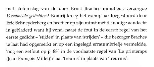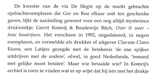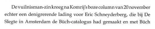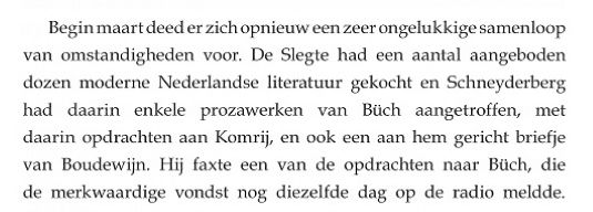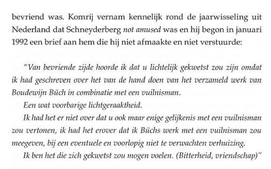 Treurnis, u leest het zelf, en jolijt omdat ik merk dat de biograaf refereert aan fouten van anderen. De Verzamelde Gedichten van Boudewijn Büch is een boek met een nogal ingewikkelde ontstaansgeschiedenis, waar ik als mede-samensteller en mede-slachtoffer op deze plek niets over kwijt wil. Behalve dan dat het door mijn eigen stomme schuld een afschuwelijk vormgegeven bron van grotendeels nutteloze informatie is geworden waarin Boudewijns dichtwerk volledig kopje-onder is gegaan [14]. Het nut van vermelding van de wijze van verzenden [15] ontgaat me een beetje; wil de biograaf ons wellicht duidelijk maken dat Boudewijn te lui zou zijn geweest om zelf naar het postkantoor te lopen? Voor wat het waard is: het is een van de exemplaren die op mijn verzoek door Boudewijn van extra opdracht werden voorzien, ik (niet hij, maar ik) vond dat Gerrit er ook eentje verdiend had. Met nummer 8 bofte Gerrit eigenlijk nog: Ernst Braches kreeg nummer 9, maar daar zat niet echt een gedachte achter. In Komrijs archief bevindt zich een brief die deze op het eerste gezicht wellicht wat wonderlijke gedachte verklaart: Vila Pouca da Beira, 26 mei 1995 Beste Eric, Ik ben een tijdlang niet onserieus ziek geweest, en ik vraag om je begrip voor het feit dat ik niet eerder van me heb laten horen. Je zult er wel alvast uit hebben afgeleid dat het niet heeft willen lukken met het artikel over Boudewijn. Komrij doelt hier op zijn aan mij gedane toezegging de Verzamelde Gedichten van Boudewijn Büch van een VOORWOORD te voorzien. We lezen verder. Ik heb je bij onze laatste ontmoeting al gezegd dat ik niet de capaciteiten bezit om een doorwrocht artikel over Boudewijns poëzie te schrijven; met wat ik een tijd geleden heb geprobeerd ben ik niet verder gekomen dan wat herinneringen aan ons gezamenlijk optrekken met Ger Kleis en Sub Signo Libelli. Ook als het voltooid was geworden zou het, realiseer ik me, als een voorafje bij zo’n minutieus titanenwerk en monumentale presentatie als die van Ernst Braches als kut op dirk hebben geslagen. Het zou als gelegenheidsartikeltje geheel uit de toon zijn gevallen. Ik sta nog altijd positief tegenover je voorstel, maar het lijkt me nuttiger en minder ontsierend om het eens te doen voorin een uitgaafje in beperkte oplage of bij een catalogus. Met oprechte groet, je Gerrit Komrij Dit alles naar aanleiding van de "povere blijk", niet de verwarren met de "povere blik" die de biograaf ons gunde in zijn archieven. We slaan het boekje dicht en ik strompel op eigen kracht richting apotheose. Gerrits laatste blijk bestond uit het laten herdrukken van nare stukjes, zoals bijvoorbeeld dat hele bijzondere artikeltje uit NRC Handelsblad van 20 november 1991, in zijn in 2005 verschenen bundel Eendagsvliegen. Eerder had ik Komrij al tijdens een ontmoeting in Amsterdam verteld over mijn teleurstelling in verband met een in mijn ogen onnodig kwetsende tekst over Boudewijn, PRAATJES, opgenomen in zijn toen net verschenen boek DEMONEN. Gerrit reageerde begripvol. Niet veel later las ik in de weergave van een vraaggesprek met hem in het Vlaamse weekblad HUMO, 9 maart 2004, het volgende: Ik kwam laatst Eric Schneyderberg tegen, die zich tot stadhouder van Boudewijn Büch op aarde benoemd heeft, en die was woedend over wat ik over Boudewijn geschreven had. Dat begrijp ik niet: als je dat goed leest, is het toch een liefdesverklaring aan die jongen? Waarmee maar weer eens is aangetoond dat Komrij over een scherpe pen beschikte maar met de directe confrontatie minder goed uit de voeten kon. Het feit dat Gerrit Komrij mij op deze manier publiekelijk te grazen heeft willen nemen ervaar ik als koddig, maar tegelijkertijd ook als eervol: Van Vuilnisman tot Stadhouder, het had allemaal veel slechter kunnen aflopen. Eric Schneyderberg - november 2023 (laatst herzien januari 2026) NB: Deze gedachten zijn niet opgetekend om Gerrits discipelen op de kast te jagen [16] maar om Boudewijn postuum een steuntje in de rug te geven [17], laat dat duidelijk zijn. Aangaande het gebruik van citaten verwijs ik naar de zogenaamde fair use clausules. ----------------------------- ----------------------------- NOTEN: [1] Op het moment dat ik het idee kreeg om t.g.v. de 100e respectievelijk 75e verjaardag van Gerard Reve en Boudewijn Büch, 14 december 2023, enkele anecdotes op mijn website te publiceren herinnerde ik mij dat er eind vorig jaar een boekje was verschenen over Gerrit Komrij en Boudewijn Büch. Ik schafte het werkje niet eerder aan omdat ik het een nodeloos kwetsende tekst vind en bovendien niet het idee had dat er in dat nawoord iets kon staan dat ik nog niet wist. Uiteindelijk belandde het toch bij mij in de brievenbus. Het boekje in kwestie is: Gerrit Komrij. PRAATJES, met een nawoord door Arie Pos (Leidschendam, Büchmania, 2022), het betreft een separate herdruk over 4 pagina’s van een tekst uit de bundel DEMONEN (Amsterdam, Bezige Bij, 2003), het 27 pagina’s tellende nawoord draagt de titel Bou en Ger, een mooie vriendschap die verzuurde. [2] Eens biograaf, altijd biograaf, overal biograaf, ook waar het side projects aangaat. Geloofwaardigheid voorop, dat is mijn mening. [3] Toch was er sprake van één uitzondering: Dichter/schrijver/archeoloog/vriend/mentor F.L. Bastet, van wie Büch ook enkele boeken van de hand deed, schreef het sonnet Aan een dichter. Het vers werd (onder bij insiders bekend geacht pseudoniem) afgedrukt op de allereerste pagina van de eerstvolgende aflevering van het literaire tijdschrift Maatstaf. Dit zijn de twee meest opvallende regels: Herken het bloedgeld, bijbels als de daad Domweg inhalig in de Kalverstraat Een uiterst stijlvolle, persoonlijke reactie en dat zeg ik zonder enige vorm van ironie. Het is duidelijk dat een dergelijke subtiele aanpak voor Komrij niet doeltreffend genoeg was. Zich bewust van zijn status en de omvang van zijn achterban zette hij in op een (overigens niet geheel geslaagde) "openbare excecutie". [4] Dit is de situatie zoals ik mij die herinner: Op 5