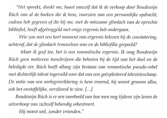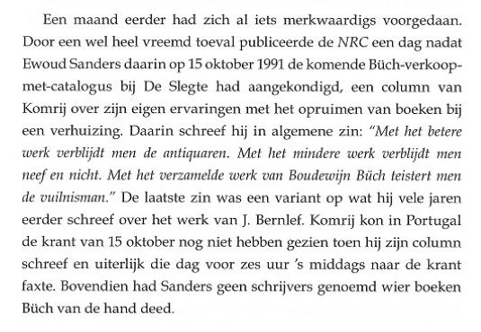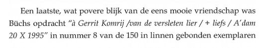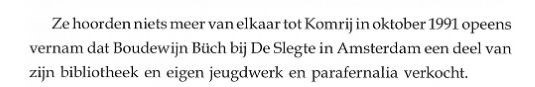 Deze wel heel strategisch uit verband gerukte regels zijn onderdeel van een uitgebreide fax die Boudewijn verzond naar aanleiding van het feit dat Komrij, zoals ik hem vertelde, een aantal opvallend vriendelijke woorden [6] voor hem over had tijdens zijn eerste bezoek aan mij in de Amsterdamse Kalverstraat, woensdag 27 mei 1992. Dat was een beladen bezoek: Gerrit kwam wat ongemakkelijk de spulletjes ophalen waar in deze tekst zo belachelijk veel om te doen is geweest. Een klein lullig stapeltje boeken, Boudewijn had zijn eigen brief geconfisqueerd en ik had de vrijheid genomen de twee opdrachtexemplaren achterover te drukken. Schadevergoeding. Gerrit kwam voor Boudewijn Büch maar moest naar huis met Dirk Ayelt Kooiman. Dubbele schadevergoeding. | ||